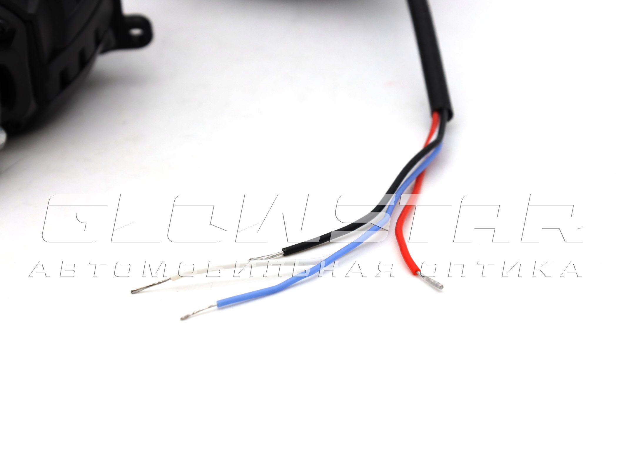 - Белый провод - плюс, синий провод - минус (дальний свет - шторка)