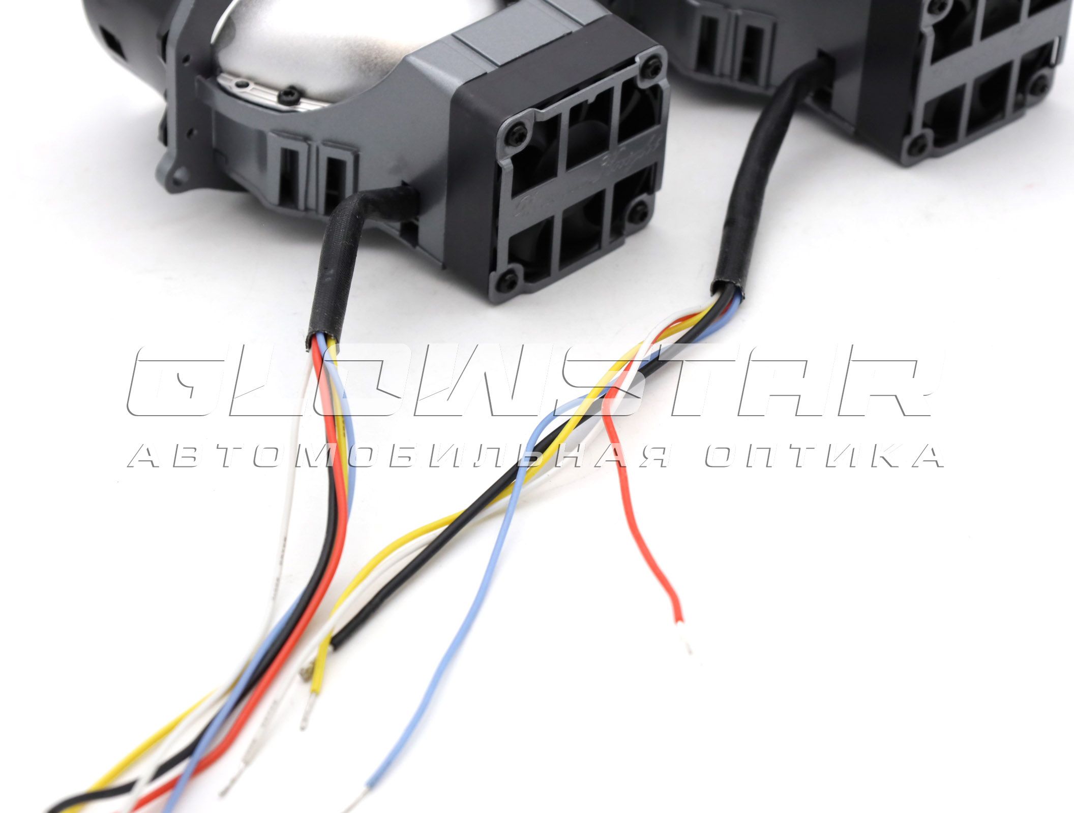 Подключение: красный провод плюс, черный провод минус (ближний свет), белый провод плюс, синий провод минус (дальний свет, шторка), желтый провод плюс (дополнительный чип).