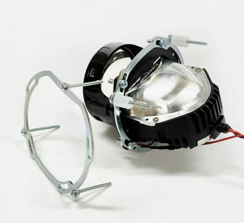 Крепежные рамки для врезки линз в отражатель. Данные рамки предназначены для крепления линз в фары в которых изначально отсутствуют линзы. На 3 шпильки крепежные рамки крепятся в отражателе фары, а билед линза в свою очередь крепится в данную рамку на 4 болта. Благодаря специальным прорезям в рамке можно регулировать горизонт у бимодуля вращая его по часовой или против часовой стрелки.
